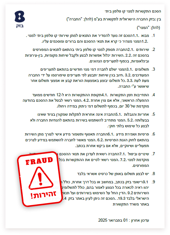 במידה וקיבלתם SMS ו/או דוא"ל מטעם חברת בזק שמעורר בכם חשד אין להקיש על הקישור המצורף, מומלץ לפנות לחברת בזק בערוץ הנוח לכם: