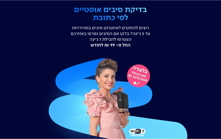 בקיומו של נתב Be ובכפוף לתנאי השימוש והשכירות. למצטרפים חדשים לסיבים בחבילת 1 Bfiber ג'יגה במחיר חודשי לחודשים 1-2: 99 ₪ לחודש כולל נתב בשכירות, לחודשים 3-6: 118.90 ₪ לחודש כולל נתב בשכירות או 99 ₪ לחודש לא כולל נתב, מחיר חודשי לחודשים 7-12: 158.90 ₪ לחודש כולל נתב או 139 ₪ לחודש לא כולל נתב. לחודשים 13-36: 180.20 ₪ לחודש כולל נתב בשכירות או 160.30 ₪ לחודש ללא נתב, החל מחודש 37 ואילך: 216.50 ₪ לחודש כולל נתב בשכירות או 196.60 ₪ לחודש ללא נתב. מהירות הורדה: 0.01-1000 mbs, מהירות העלאה: 0.01-100 mbs. הקצב כולל תקורות של פרוטוקול תקשורת של כ10%. נתב בשכירות כולל הגנת סייבר, החל מחודש 3 בתוספת בתשלום של 19.90 ₪ לחודש. התקנת Bfiber בחינם במידה וקיימת תשתית סיבים בבית הלקוח ובתשלום במידה ולא קיימת תשתית סיבים, דירה בבניין: 199 ₪, דירה בצמוד לקרקע: 499 ₪. המחירים כוללים מע"מ. ניתן להצטרף עם ציוד פרטי לפי רשימת הציוד המורשה המפורסמת באתר. בכפוף להסכם המנויים של בזק למגבלות הטכנולוגיות, לתנאי המסלולים, השכרת הציוד והשירות ומדיניות הפרטיות של בזק . להתכנות תשתית סיבים אופטיים של בזק בכתובת הלקוח וקיום ציוד תומך (לרבות כבל רשת וכרטיס רשת). מידע בדבר קבלת חומר שיווקי התמונות להמחשה בלבד.