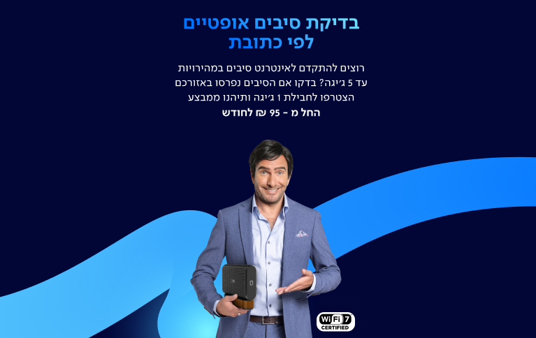 למצטרפים חדשים לסיבים בחבילת 1 Bfiber ג'יגה מבצע 5 חודשים ב- 95 ₪ לחודש, כולל נתב בשכירות (במקום 99 ₪ לחצי שנה ולחודשים 7-12 139 ₪ לחודש, ללא נתב). בכפוף לתקנון המבצע עד 15.3.26. מחיר חודשי לחודשים 6-12: 158.90 ₪ לחודש כולל נתב או 139 ₪ לחודש לא כולל נתב. לחודשים 13-36: 180.20 ₪ לחודש כולל נתב בשכירות או 160.30 ₪ לחודש ללא נתב, החל מחודש 37 ואילך: 216.50 ₪ לחודש כולל נתב בשכירות או 196.60 ₪ לחודש ללא נתב. מהירות הורדה: 0.01-1000 mbs, מהירות העלאה: 0.01-100 mbs. הקצב כולל תקורות של פרוטוקול תקשורת של כ10%. נתב בשכירות כולל הגנת סייבר, החל מחודש 6 בתוספת תשלום של 19.90 ₪ לחודש.